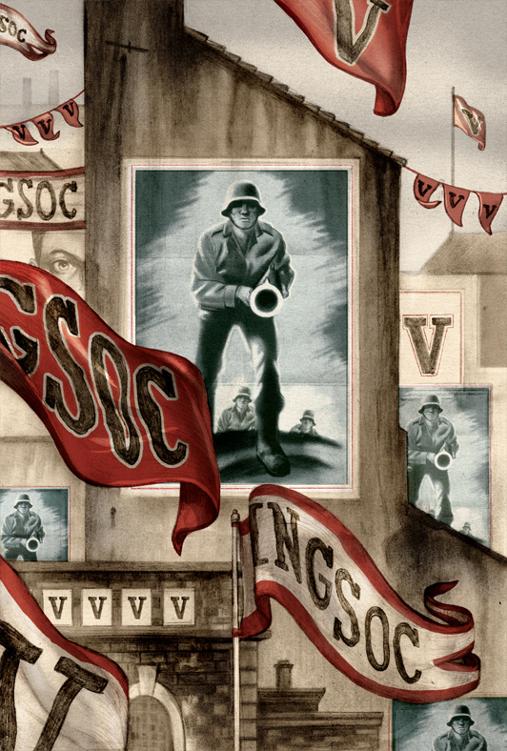 新制招贴遍贴伦敦各地。这图片三四米高,上面是个手执冲锋枪、穿着巨型军靴、面无表情的欧亚国士兵。图片下并无说明。无论你从哪个角度看去,按照透视原理那个枪口都好像瞄着你准备随时发射。在伦敦街头,看到墙壁,就看到这蒙古脸的士兵,其出现的次数,比老大哥的肖像还要多。无产者一向对战争的态度冷淡得很,现在周期性的煽动就是要刺激他们的爱国情绪。好像为了配合敌忾同仇的气氛,火箭弹制造的伤亡也比以前大为增加。其中一个落在斯特尼戏院区,几百人就埋在那里。附近居民参加出殡的行列,走了好几个钟头。这葬礼也给了他们憎恨敌人的机会。另外一个则落在小孩玩耍的荒地,几十个孩子炸得血肉模糊。接着无产者就到街头泄愤示威了,焚烧戈斯坦的画像,把几百张撕下来的欧亚国士兵图片投入火中。也有人趁火打劫,到商店去抢东西。不久就有谣言传出,说这些火箭弹是间谍用无线电控制的。一对有外国血统嫌疑的老夫妇,房子被烧了,人也殉了葬。